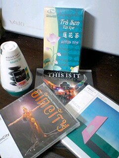 マイケルのDVD(タワレコ限定Ver)、師匠のCD2枚(Sim CityとP時代のPerspective)、蓮の花のお茶(ティーパック型。匂いがきつくても味はお茶そのもの。)、蓮の柄がついてたからホイホイ釣られちゃった芳香剤(ちょう臭い。天然成分って書いてるけどちょう臭い。)を買いました。