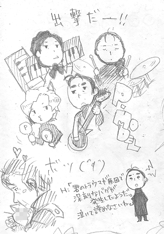これ描く前にライブ映像見てたのでヒラサワ、ことぶき、あきやま、ヤスチカのP。